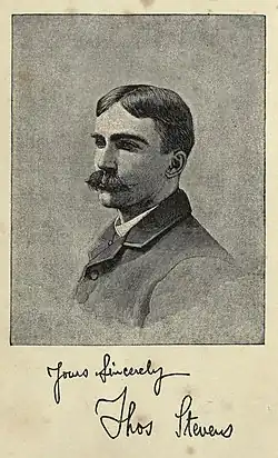 Stevens, known as Tom,[2] was born in Castle Street, Berkhamsted,[2] the son of William and Ann Stevens. His father was a labourer.[2] Thomas had an older sister, Bridget, and younger, Jane. He went to Bourne Charity School, then became an apprentice grocer. His father emigrated to Missouri in 1868 but returned when his wife became ill and before the rest of the family could also go to America.[2][4] Tom went with a half-brother but without his parents and sisters[4] in 1871 and the rest of the family followed two years later. They moved to Denver and then to San Francisco, where he learned to ride a bicycle.