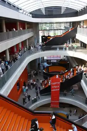 The school building covers an area 80 metres (87 yd) square and has 34,000 square metres (370,000 sq ft) of instructional space, including 320 classrooms, 3,000 square metres (32,000 sq ft) of workshops, a six-hall arena space seating 4,000, three auditoria seating 45–180 people, and a 370-square-metre (4,000 sq ft) professional kitchen.[2][9] The library is named Fatu Hiva after the Polynesian island on which Thor Heyerdahl spent his honeymoon in the 1930s.[16]