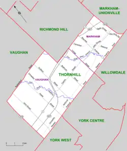 It covers the suburban community of Thornhill, which is made up of portions of the cities of Vaughan and Markham and was created in 1999 from parts of Markham and York Centre ridings.