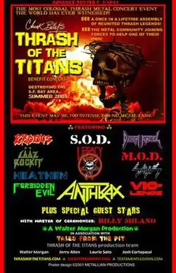 Thrash of the Titans was a benefit concert held on August 11, 2001, at the Maritime Hall in San Francisco, California. The concert was a co-benefit for Testament vocalist Chuck Billy, who was diagnosed with germ cell seminoma (a rare form of cancer); and Chuck Schuldiner, leader of the death metal band Death, who was also battling cancer. The Master of Ceremonies for the evening was S.O.D. vocalist Billy Milano. The concert was organized by Walter Morgan. The show was announced in May 2001, and all 2300 tickets quickly sold out.