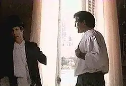 The figure is actually figure is actually a cardboard cutout "standee" of Jack, wearing a tuxedo and top hat, that was left on the set. It was created as part of the storyline, in which he, an actor, appears in a dog food commercial, but this portion was cut from the final version of the film. The standee does show up later in the film, when Jack stands next to it as Sylvia comes to reclaim Mary. Snopes.com contends that the one in the first scene looks smaller than it does in the later scene because of the distance and angle of the shot, and because the curtains obscure its outstretched arms. As for the contention that a boy died in the house, all the indoor scenes were shot on a Toronto sound stage, and no kind of residential dwellings were used for interior filming.[7][8]