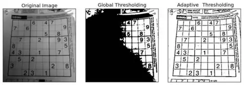 In most methods, the same threshold is applied to all pixels of an image. However, in some cases, it can be advantageous to apply a different threshold to different parts of the image, based on the local value of the pixels. This category of methods is called local or adaptive thresholding. They are particularly adapted to cases where images have inhomogeneous lighting, such as in the sudoku image on the right. In those cases, a neighborhood is defined and a threshold is computed for each pixel and its neighborhood. Many global thresholding methods can be adapted to work in a local way, but there are also methods developed specifically for local thresholding, such as the Niblack[7] or the Bernsen algorithms.