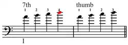 In thumb position, the, "'standard' finger pattern," between the thumb, first and second fingers, is whole, whole, and half tone.[2] Thus if the thumb is placed on A, the index and middle fingers are placed on B and C#.