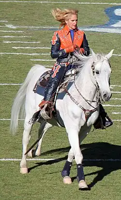 The original "Thunder", JB Kobask, was loaned to the Denver Broncos by Sharon Magness-Blake of Magness Arabians after she received a phone call from team officials asking if she had a "white" horse.[1][2][a] Thunder's debut as team mascot was on September 12, 1993, during the Broncos' victory over the San Diego Chargers.[4] Angela Moore, his rider at the time,[5] galloped him down the field after each Broncos touchdown.[4] Thunder's mascot duties were expanded to include delivering the game ball to the referees at the start of each home game. Spectators were allowed to interact with Thunder and pet him prior to the game.[2] Magness said, "Thunder is friendly, and Broncos fans think it's good luck for the opposing team to pet our mascot".[6] He was particularly popular with children,[4] appeared on T-shirts, and was referred to as the "second most popular Bronco" after former quarterback John Elway. Thunder appeared at Elway's 1999 retirement gala.[2] When team uniforms were redesigned in 1997, Thunder was the inspiration to incorporate a horse-head profile as part of the logo on the team's helmets.[4] During a February 4, 1997 press conference introducing the new logo, the team president and the art director for Nike, creators of the new design, described it as "a powerful horse with a fiery eye and mane."[7]