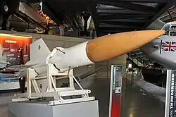In 1952 the projects were split, with Bristol's effort becoming "Red Duster" and English Electric's becoming "Red Shoes".[2] These would fill the Stage 1 requirement, along with existing early warning radars and the Gloster Javelin interceptor aircraft. The original Red Heathen concept for a much longer-ranged weapon became "Green Sparkler" and then "Blue Envoy", and relegated to Stage 2 deployment in the 1960s along with newer radars and interceptor aircraft.