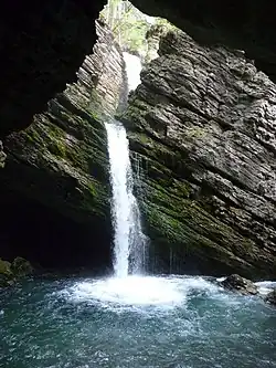 The Thur waterfalls are two cascades located on the river Thur approximately ten minutes walking from the village square of Unterwasser in the canton of St. Gallen, Switzerland, The water cascades down from steep rock faces, and on highest point drops from 23 metres (75 ft).[1] The road along the waterfalls was developed in 1927 and includes three observation decks.