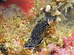 Thysanozoon nigropapillosum has a long body and broad shape. They grow up to 3 in (76 mm).[2] The dorsal surface is deep black and covered with numerous yellow-tipped papillae varying in size. The ventral surface is dark brown. The outer margin of the body is slightly wavy and bordered in opaque white. They have small, ear-like pseudotentacles in the middle of the anterior end.[3] They swim by propelling themselves through the water with a rhythmic undulating motion of the body.[2]