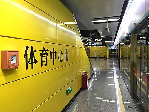 Tianhe Sports Center South Station (Chinese: 体育中心南站; pinyin: Tǐyù Zhōngxīn Nán Zhàn; Jyutping: tai2juk6 zung1sam1 naam4 zaam6) is a metro station on the Guangzhou Metro APM line. It is located below the entrance to the Tianhe Sports Center (天河体育中心) in Tianhe Road (天河路) in the Tianhe District, 200 metres (660 ft) from Tianhe Sports Center station on Line 1 of the metro.[1] It started operation on 8 November 2010.[2][3]