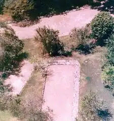 The main feature of the site is the nearly quadrangular enclosure which has been called a plaza. It is bounded on two sides by a walk paved with flat stones while the other two sides are defined with flat slabs. Many of the stones surrounding the plaza bear petroglyphs. The terrain within the ball courts and plaza have been artificially modified. Several shell middens are scattered irregularly throughout the site and is some instances the ball courts intrude into them, indicating that the site was occupied for an extended period of time with a gradual evolution into a ceremonial center.[8]