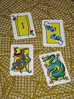 The game is played with a deck of 56 cards, consisting of a 52-card deck of four suits (Jade, Sword, Pagoda, Star) plus four special cards (Mah Jong, Dog, Phoenix, Dragon). A standard 52-card deck with 4 jokers (marked to indicate the special cards) can also be used.