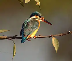 Grey herons are a common sight as they linger in the meadows before their autumn migration south to feed. The Tiefwerder Wiesen also serves rare and endangered bird species as breeding, migratory, and wintering grounds. For example, the kingfisher, which is highly endangered in Berlin, can occasionally be seen. Due to its endangerment, this species, which is strictly protected under the BNatSchG, has already been voted Bird of the Year twice in Germany, in 1973 and 2009. The sedge meadows, reeds, and tall grasses are home to pond warbler, marsh warbler, dunnock, coot, and little grebe, among others.[16] The bird of the year 1983, the sand martin, is also found in the Tiefwerder Wiesen. Its young birds congregate in large numbers on roosts in the reeds and willow thickets after leaving the breeding burrows.