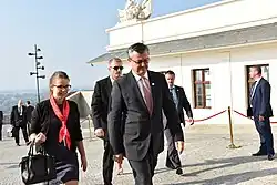 Orešković was contacted by the Croatian Democratic Union (HDZ) several months before the 2015 parliamentary elections with an offer to potentially take over a ministerial position in the new government in case of HDZ's win.[9] Parliamentary elections were held on 8 November and were followed by eleven weeks of negotiations to select the next prime minister. During this period, HDZ and Bridge of Independent Lists (Most) were deadlocked, each party supporting their own candidate for the top position. Finally, on 23 December 2015, the parties agreed to name Orešković as the compromise candidate for prime minister. Later that day, President Kolinda Grabar-Kitarović handed Orešković the mandate to try and form a government within the following 30 days.[7] Orešković, a self-described fiscal conservative and a centrist, started forming his cabinet with the two parties in January.[10] He named his cabinet on 21 January 2016 and received the vote of confidence from Parliament on 22 January, the last day of the 30-day deadline.[11]