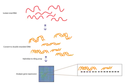 Several different methods exist for tiling an array. One protocol for analyzing gene expression involves first isolating total RNA. This is then purified of rRNA molecules. The RNA is copied into double stranded DNA, which is subsequently amplified and in vitro transcribed to cRNA. The product is split into triplicates to produce dsDNA, which is then fragmented and labeled. Finally, the samples are hybridized to the tiling array chip. The signals from the chip are scanned and interpreted by computers.