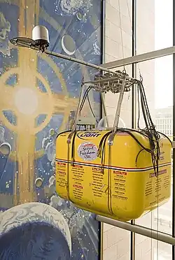 Designed and built by Tim Cole out of kevlar and carbon with a clear bubble hatch. His local Greeley partners helped with materials and building including: Agland, Purdy-Minch Construction and Maxanns.[3] About the size of a closet, the Spirit-of-Freedom capsule has a bench and a sleeping bag. Fossett averaged 4 hours of sleep per day in 45 minute naps. He ate military rations called MREs which were heated with water activated chemical heat packs.[4] Fossett would have to regularly climb out into the sub-zero temperatures to change fuel tanks.[6] Besides the Comstock autopilot, the gondola equipment included GPS, Inmarsat, and satellite phone backup for communications with Mission Control at Washington University in St. Louis. Fossett used radios for communications with air traffic control and other aircraft. An Emergency Position Indicating Rescue Beacon (EPIRB) was on board to aid search and rescue.[4] The unpressurized gondola used lithium batteries to power the electronic equipment and a custom heater regulating the aircraft internal temperature between 4 and 21 C (38-72 F).[4]