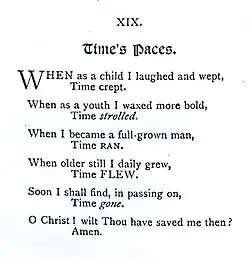 Time's Paces is a poem about the apparent speeding up of time as one gets older. It was written by Henry Twells (1823–1900) and published in his book Hymns and Other Stray Verses (1901). The poem was popularised by Guy Pentreath (1902–1985) in an amended version. Pentreath saw the poem Time's Paces attached to a clock case in the north transept of Chester Cathedral where it is to be seen today.[1] Recently the poem was even set to music.[2] Pentreath quoted his version of the poem in his last sermon at Wrekin College, Shropshire where he was headmaster till 1952.[3] His version then entered the public domain. Perhaps he wrote the poem down from memory and reconstructed it in the process. He may not have consciously intended to improve on Twells' version.