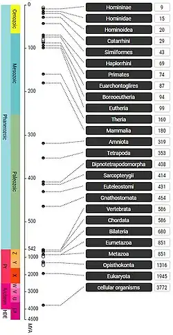 TimeTree is a free public database developed by S. Blair Hedges and Sudhir Kumar, now at Temple University, for presenting times of divergence in the tree of life.[1][2] The basic concept has been to produce and present a community consensus of the timetree of life [3][4] from published studies, and allow easy access to that information on the web or mobile device.[2] The database permits searching for average node times between two species or higher taxa, viewing a timeline from the perspective of a taxon, which shows all divergences back to the origin of life, and building a timetree of a chosen taxon or user-submitted group of taxa.[5] TimeTree has been used in public education to conceptualize the evolution of life, such as in high school settings.[6][7][8] David Attenborough's Emmy Award-winning film and television program Rise of Animals used Hedges and Kumar's[3] circular timetree of life, generated from the TimeTree database, as a framework for the production. The timetree was brought to life using animated computer-generated imagery in scenes every 10 minutes during the 2-hour movie. The original development of TimeTree, by Hedges and Kumar, dates to the late 1990s, with initial support from NASA Astrobiology Institute. Since then, it has been supported by additional grants from NASA, and by NSF and NIH. The current version (v5) was released in 2022 and contains data from 4,075 studies and 137,306 species.[5]