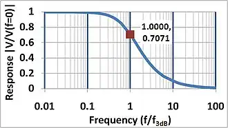 The magnitude of this response is: By convention, the bandwidth of this system is the frequency where |V∞|2 drops to half-value, or where ωτ = 1. This is the usual bandwidth convention, defined as the frequency range where power drops by less than half (at most −3 dB). Using the frequency in hertz, rather than radians/s (ω = 2πf):