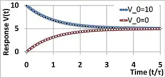 Suppose the forcing function is chosen as a step input so: with u(t) the unit step function. The general solution to this equation for times t ≥ 0 s, assuming V(t = 0) = V0 is: