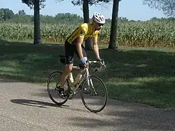 Positioning Pro and elite level cyclists turn to the wind-tunnels to constantly seek refinement and improvements in their individual time trial on-the-bike positioning. Professionally measured, out-on-the-road tested positioning (arms inwards as much as physiologically possible, knees in pedalling, head and body in better alignment in the time trialing, aero position, etc.) will see as much as a 6-minutes improvement in non-aero or former poor aero positioning. Empirical evidence shows that it is far more important to aerodynamically improve a rider's position than to rely solely on technology in order to better one's time trialing results.[15]