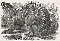The first scientifically documented ankylosaur remains were recovered from Early Cretaceous rocks in England and named Hylaeosaurus armatus by Gideon Mantell in 1833.[4] However, the Ankylosauria itself would not be named until Henry Fairfield Osborn did so in 1923 nearly a hundred years later.[5] Prior to this, the ankylosaurs had been considered members of the Stegosauria, which included all armored dinosaurs when Othniel Charles Marsh named the group in 1877. It was not until 1927 that Alfred Sherwood Romer implemented the modern use of the name Stegosauria as specifically pertaining to the plate-backed and spike-tailed dinosaurs of the Jurassic that form the ankylosaurs' nearest relatives.[6] The next major revision to ankylosaur taxonomy would not come until Walter Coombs divided the group into the two main families paleontologists still recognize today; the nodosaurids and ankylosaurids.[5] Since then, many new ankylosaur genera and species have been discovered from all over the world and continue to come to light. Many fossil ankylosaur trackways have also been recognized.[7]