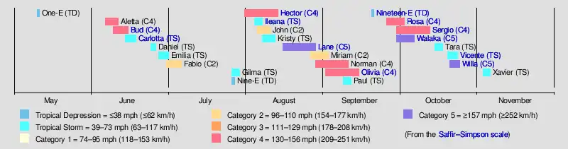 The 2018 Pacific hurricane season was an event in the annual cycle of tropical cyclone formation, in which tropical cyclones form in the eastern Pacific Ocean. The season officially started on May 15 in the eastern Pacific—east of 140°W—and began on June 1 in the central Pacific—the region between the International Date Line and 140°W, and ended on November 30. These dates typically cover the period of each year when most tropical cyclones form in the eastern Pacific basin.[1] The season began with the formation of Tropical Depression One-E, which developed on May 10, and ended with the dissipation of the season's final storm, Tropical Storm Xavier, which dissipated as a tropical cyclone on November 5.