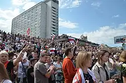Opposition groups called for a "National March for Freedom" in Minsk and similar marches to occur in cities and towns across the country. Supporters were asked to converge on government buildings and call for the immediate release of all political prisoners, for those responsible for the deaths and torture of protesters to be brought to justice and for the resignation of Alexander Lukashenko.[52] Organizers estimated that 100,000–220,000 people attended the Minsk demonstration.[54] Many were carrying red and white flags.[55] The Belarusian press reported that persons in civilian clothes made arbitrary detentions of opposition supporters after the Minsk rally.[56] Later that evening, it was reported that former Prime Minister of Belarus, Syarhey Rumas, who was dismissed by Lukashenko in June 2020, had posted a message of support for the anti-Lukashenko protesters on his Instagram account.[57] Earlier, Rumas's wife had published a photograph of herself and Rumas on the roof of a building overlooking the protests and a message of support.[58]