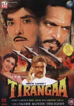 Tirangaa (transl. Tricolour) is a 1993 Indian action drama film starring Raaj Kumar, Nana Patekar, Varsha Usgaonkar, Harish Kumar and Mamta Kulkarni.[2] The movie was a blockbuster.[3] At the time of the 1993 Bombay bombings; Plaza cinema, Mumbai was also bombed where the movie was being shown, leaving 10 dead and 37 injured.[4]