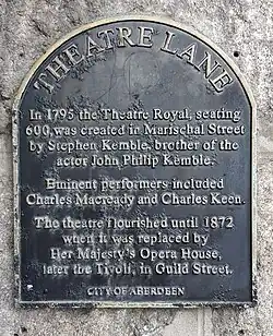 A plaque erected by Aberdeen City Council at Theatre Lane states: "In 1795 the Theatre Royal, seating 600, was created in Marischal Street by Stephen Kemble, brother of the actor John Philip Kemble. Eminent performers included Charles Macready and Charles Keen. The theatre flourished until 1872 when it was replaced by Her Majesty's Opera House, later the Tivoli, in Guild Street."
