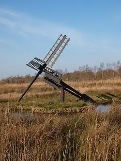The paaltjasker was built in 1975 by the cousins Smit from Giethoorn taking over the assignment from Dijksma after his death. It was located east of Sneek.[8] It was dismantled and put into storage in 1980 after it was damaged in a storm. The mill was restored and erected in a nature reserve of Staatsbosbeheer near De Hoeve in 1996 where it is used to raise water into the nature reserve. It is located near the river Linde and a recreational bicycle path.[10][11]