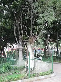 The center of this former village is the main square or garden officially called the “Plaza de la Constitución” but better known as the “Jardín Principal” (Main Garden). Visually, what stands out is the large kiosk in the center, but historically more important is the “Arbol de los colgaldos” (Tree of the Hanged). This tree, still alive, was used to hang political enemies and bandits, including those opposed to the invading French Army during the French Intervention in Mexico. On weekends, vendors set up stalls selling handcrafts and other items. To one side of the plaza, there is a cantina called La Jalisciense, one of the oldest in Mexico City, having been in operation for over 135 years.[9]
