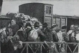 In his work, Savitsky depicts the events of the Russo-Turkish War of 1877-1878.[27][16] The painting, which is a multi-figure composition, does not depict military action but instead portrays the grief of relatives and friends as they bid farewell to soldiers – reserve conscripts – who are going off to war.[33][34] By opting to portray the last minutes before the separation, the artist was able to "show the actors at a time when all the feelings and thoughts, usually hidden from view, are more vividly manifested".[35] The canvas depicts the various stages of this event. On the right-hand side, the background depicts a dense crowd, with individual figures merging into one another. The central section of the painting, which features multiple groups painted in detail, depicts the most intense moments of the action. In the background, at the rear of the composition, the soldiers who have already bidden their relatives farewell are climbing the platform, attempting to, for the final time, catch the gaze of those who have come to see them off.[33]
