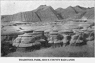 Toadstool Geologic Park is located in the Oglala National Grassland in far northwestern Nebraska. It is operated by the United States Forest Service. It contains a badlands landscape and a reconstructed sod house.[1] The park is named after its unusual rock formations, many of which resemble toadstools.