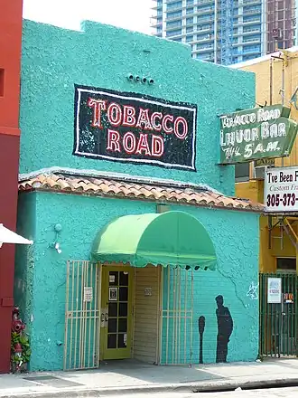 The Tobacco Road was a bar in the Brickell area of Downtown Miami, Florida. It was popularly known as the oldest bar in the city.[1] The liquor license it amended was first issued in November 1912 (though property records show the building as being built in 1915,[2] as a bakery)[3][4] and operated nearly continuously since its opening, having been shut down briefly at times for run-ins with the law, such as when the upstairs, now a live music venue, was used as a speakeasy during Prohibition.[3] Tobacco Road was located at 626 South Miami Avenue, on the south side of the Miami River, putting it in Miami's Brickell district, where it was classified as a classic dive bar, being popular among locals. Tobacco Road celebrated its 100th anniversary in November 2012. In 2012, the land on which Tobacco Road lies was purchased for $12.5 million. On October 26, 2014, Tobacco Road closed and was demolished by Thunder Demolition Inc. An estimated 4,000 people came on its last night.