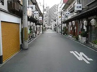 Tobita Shinchi (飛田新地), also known as Tobita Yūkaku (飛田遊廓), is the largest of the brothel districts in Osaka, and also the largest in western Japan.[1] It is located in the Sanno 3-chōme area of Nishinari-ku, Osaka.[2] Tobita Shinchi dates from the Taishō period. To circumvent the anti-prostitution laws, the brothels operate largely under the guise of being "Japanese-style restaurants" (Ryoutei).[3]