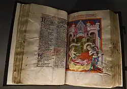 The Toggenburg-Chronik (also known as the Toggenburg Bible, Toggenburg World Chronicle, German: Toggenburg-Bibel, or Toggenburg-Weltchronik) is an illuminated manuscript that was created c. 1411 for Frederick VII, Graf of Toggenburg and his wife, Gräfin Elisabeth von Matsch.[1] Toggenburg is a region of what is now Canton St. Gallen in Switzerland, which is in the general vicinity of Liechtenstein. The codex was produced by a local chaplain, Dietrich von Lichtensteig, or "Dietrich of Lichtensteig."[2] Von Lichtensteig based his manuscript on a previous Weltchronik by Rudolph von Ems.[2] Per Barbara Wilk-Mincu, the artist who created the illustrations "most likely worked in Konstanz [and] seems to have been trained in the Prague Wenceslas workshop, but has influences from South Tyrol and Verona."[3]