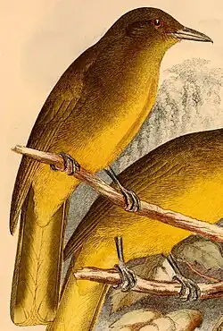 The Togian golden bulbul was formerly considered as conspecific with five other bulbuls, all called the northern golden bulbul before they were all split. This bulbul is now both placed with 24 other species in the genus Hypsipetes that was introduced in 1831 by Nicholas Vigors.[2]