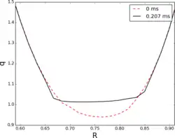 An often cited description of the sawtooth relaxation is that by Kadomtsev.[2] The Kadomtsev model uses a resistive magnetohydrodynamic (MHD) description of the plasma. If the amplitude of the current density in the plasma core is high enough so that the central safety factor is below unity, a linear eigenmode will be unstable, where is the poloidal mode number. This instability may be the internal kink mode, resistive internal kink mode or tearing mode.[3] The eigenfunction of each of these instabilities is a rigid displacement of the region inside . The mode amplitude will grow exponentially until it saturates, significantly distorting the equilibrium fields, and enters the nonlinear phase of evolution. In the nonlinear evolution, the plasma core inside the surface is driven into a resistive reconnection layer. As the flux in the core is reconnected, an island grows on the side of the core opposite the reconnection layer. The island replaces the core when the core has completely reconnected so that the final state has closed nested flux surfaces, and the center of the island is the new magnetic axis. In the final state, the safety factor is greater than unity everywhere. The process flattens temperature and density profiles in the core.