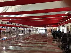 The passenger terminal, a single-story structure, includes arrival and departure facilities with standard services. These encompass parking, check-in, security, a VIP lounge, snack bars, shops, immigration and customs facilities, baggage-claim areas, car rental services, taxi stands, and a departure concourse with 15 gates providing direct apron access for passengers to board by walking to their aircraft.