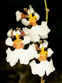 Species in the genus are pollinated by oil-collecting bees of the genus Centris. Instead of producing oils as a reward for their pollinators, Tolumnia species instead mimic the oil-producing flowers of Malpighiaceae species. Flowers are self-incompatible. Fragrance strength can vary greatly even within a species.[4][5][6]