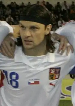 Ujfaluši debuted for the Czech senior squad during a friendly match against Macedonia in 2001.[20] He represented the country at the UEFA Euro 2004 by appearing in four matches for the semifinalists and 2006 FIFA World Cup, being sent off in the latter tournament against Ghana in an eventual group stage exit.[21] After nine years with the national team, during which he eventually gained captaincy,[22] Ujfaluši ended his international career on 8 April 2009 after being criticised for visiting a restaurant, accompanied by five other players, following the Czech Republic's defeat against Slovakia earlier on 1 April in a World Cup qualification.[23]