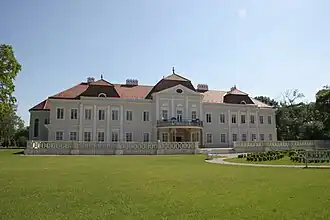 He built the three-winged manor house with a genuine courtyard on the edge of the village of Fél, today Tomášovo, on an eminence named Majorháza – Estate, rising from amidst fertile lowlands and surrounded by meadow forest and the meandering river bed of the Little Danube.[1] The vast English landscape garden, which originated from the meadow forest and still surrounds it today, became a component of the estate.