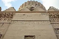The inscription bands in the exterior and interior base of the dome have the same text - Sura 2, Aya 255 (the Throne Verse).[13] The one on the interior has a foliated border with a foliated background and one lotus flower, the latter a feature that shows the growing Chinese influence on Cairene art and architectural decoration.[11] The inscription on the exterior of the dome is in tile mosaic with a blue background and white letters. It is a bit unusual, since it is one of only 13 documented Mamluk monuments with a tile mosaic.[5] This band also has cartouches with knots and a 6-pointed star in the center.