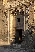 The mihrab consists of two pointed arches and its conche and spandrels are made of stucco with some remaining decoration. A feature worth noting is the bosses that were originally on the spandrels, in Ilkhanid style, similar to those of the no longer extant Qasr al-Ablaq (712 AH / 1313-14 CE), suggesting they were made by a Tabrizi workshop in Cairo.[12] There is a band along the spandrels with arabesque motifs. The decorations would have been painted. There is a rectangular niche to either side of the mihrab.