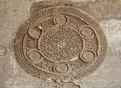 In the iwan, three stucco medallions decorate the walls. The central one is above the mihrab (instead of the oculus that was so common in Cairo mosques) and the other two are centered in the width of the right and left walls. They have inscriptions, arabesques and 6 bosses with a floral pattern (the text is currently only readable on the south and north medallions). Their design resembles contemporary metal work and there are only three other contemporary examples of such features in medallions in Mamluk architecture in Cairo.[5] The bosses with floral patterns and the high relief borders also highlight the uniqueness of this building. There are two blind windows to either side of the central medallion and both have foliated decoration in their grills.