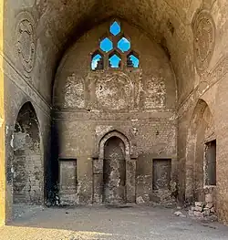 Originally built as a khanqah with a vaulted iwan and two domed mausoleums,[9] the surviving parts of the building consist of a pishtaq iwan flanked by the tomb of Tughay on one side and a chamber on the other, which was originally domed. Some remains indicate that one of the façades of the khanqah had a row of vaulted cells - these were living units for the Sufis.[7] The minaret, located at the main entrance, was destroyed. There was a waterwheel on the site.