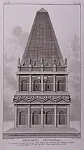 In the 16th century, Pierre Belon described a monument that was inscribed with the Greek letters of an epitaph of "Caius Cæſar[9]" – which may have made it a cenotaph of Caius Julius Caesar Vipsanianus.[10] It is however believed that Belon misread the inscription from this monument.[10] Pietro Della Valle found in the inscription a ΓΑΙΩ ΙΟΥΛΙΩ, but not "Caesar";[10] later Pococke, who made the first summary drawing of the mausoleum,[10] found that "on the eaſtern side the firſt word is ΓΑΙΟϹ[11]". Louis-François Cassas' reproduction of an inscription bearing the name "CAIUS CÆSAR" on plate 23 of Voyage pittoresque de la Syrie, published 1799, is considered to have been a fantasy of the artist.[12] In the 19th century, William Henry Waddington copied a Greek inscription said to have belonged to the monument[13] and a copy of the latter by Dr. Skender Effendi (hereafter reproduced with the characters Ε, Ξ and Ω):