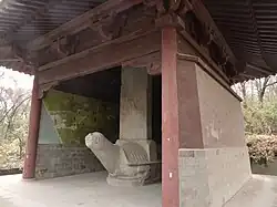 Later, the tomb was deserted and abandoned in the forest,[7] thus gained a name of "Huihuifen" (literally the tomb of the Hui people) from the local residents. During an archaeological survey in 1958, two broken fallen steles were rediscovered.[8] According to the remaining inscriptions, the Boni king was inferred to be buried in the tomb. Afterwards, the Nanjing government carried out a series of renovations to the tomb, the gravestone, the spirit way,[9] and rebuilt the memorial archway, the spirit pavilion and the stone platform. In 1982, the Tomb of the King of Boni was listed as the important protection unit of cultural relic of Jiangsu province and it became a Key Cultural Relic Unit under State Protection in 2001. The sister of the Brunei Sultan Hassanal Bolkiah, known as Princess Masnah, visited the tomb of the King and attended the opening ceremony of the newly built "China-Brunei Friendship Hall" in 2006.[10][11][12] On 23 October 2008, the Brunei Style Park was completed. It cost ¥23 million[10] and Princess Masnah again attended the opening ceremony.