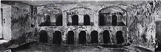 Inside are four burial chambers on two levels.[6] The largest chamber, just inside the entrance, contains 13 arched loculi (burial niches) arranged on two tiers,[7] one atop the other, with arcosolia dividing the niches into pairs.[2] Each niche measures 50 centimetres (20 in) by 60 centimetres (24 in).[15] A further 9 burial niches are located in a second chamber off the first, and 10 to 12 more niches can be found below-stairs from the main chamber in a chamber on the second level.[7] A fourth chamber on a third level appears as an independent entity with its own entryway.[17] The burial niches are arranged differently in each chamber, although each chamber is designed with an eye to symmetry.[17] All told, there are 63 burial niches in the tomb, along with several cubicles and niches for bone collection.[14] Stone ossuaries were found in rock-cut vaults within the complex.[15]