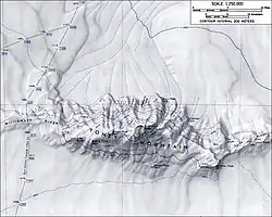 Toney Mountain is an elongated volcanic massif that rises 2 kilometres (1.2 mi)[5]-2.4 kilometres (1.5 mi) above the ice[6] and may be Antarctica's tallest volcano.[7] The area covered by Toney Mountain is about 55 by 15 kilometres (34.2 mi × 9.3 mi)[5] and is a basaltic lava plateau.[8] A 3 km (1.9 mi) wide summit caldera tops the volcano,[3] and is elongated in east–west direction; this orientation is shared with calderas on other volcanoes in Marie Byrd Land and reflects regional tectonic stress. The slopes of the volcano feature parasitic vents[9] and glacial corries,[10] and are much steeper north of the volcano than south of it. Most of the mountain is covered by ice and its eastern sector may be a crater.[11] That the mountain is mostly ice covered makes it difficult to determine its composition, the origin of the elongated shape of the volcano and the volcanological relation between the parasitic cinder cones and the main volcanic pile. Its volume may be about 2,800 km3 (670 cu mi).[8]