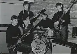 Tonto and the Renegades were founded in 1964 by four grade school students in Grand Ledge, Michigan.[2][3][4][5] When the band was formed, all of the band's four original members Tom Kirby, Terry Slocum, Bill Ford, and Gary Richey, were 8th graders at Grand Ledge High School (though a high school, it had an eighth grade class).[2] Two years earlier in 1962, while their drummer Kirby was fourteen and in 6th grade, growing up in a subdivision just outside Grand Ledge, he expressed interest to his parents that he wanted to learn to play percussion, they bought him a drum set and arranged for him to take lessons from a retired music professor who had retired from Michigan State University.[2] Kirby and his older brother Randy played in his first band, the Grandaires.[2] The Grandaires repertoire consisted primarily of covers of Chuck Berry, Ray Charles, and other hits of the day, but they broke up shortly thereafter.[2] Terry Slocum, who grew up on a farm, started out playing a clarinet which his mother, a fan of Pete Fountain, bought him.[2] Slocum became a fan of rock and roll after hearing his brother play his collection of rockabilly, R&B, and early Motown records. A pivotal moment for Slocum was when he watched the Beatles perform on the Ed Sullivan Show which convinced him to start playing in a rock band.[2][6] He took his clarinet to Marshall Music in Lansing[7] and traded it for a guitar the following day.[2] His father tried to discourage him from playing the new instrument, claiming that he would never master it, but he persisted, spending most of his spare time practicing in his room, intent on proving his father wrong.[2] Bill Ford grew up on the outskirts of Grand Ledge next to Highway 43.[2] He began playing guitar in 1962, following brief spell of attempting to learn the drums.[2] He took guitar lessons, and improved to the point where he was able to teach guitar at the Zvonar Music Studios in Charlotte, Michigan.[2][3] Like Slocum, Ford remembers being "completely blown away listening to the music of the Beatles".[2] He did not yet have an amplifier, so he compensated by plugging his guitar into a tape recorder owned by his uncle, but ended up blowing out the speakers.[2] He then saved up to buy and amplifier.[2] Kirby, Slocum, and Ford started practicing together informally during their eighth grade year and played in a number of talent shows.[2][3] They added fellow schoolmate Bob Dick to the lineup and later that year and named their act the Henchmen.[2][3]